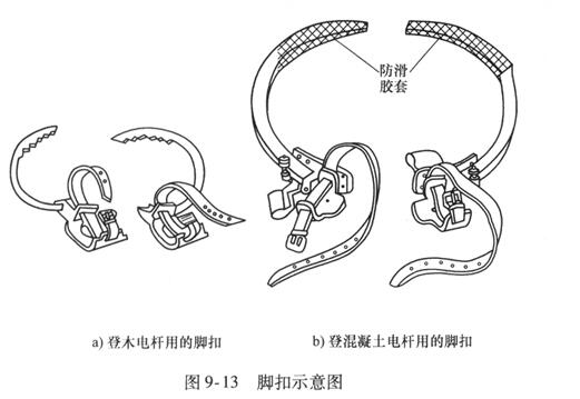 腳扣又稱鐵腳,是電工攀登電桿的主要工具。腳扣分兩種:一種扣環(huán)上帶有鐵齒,供登木桿用;另一種在扣環(huán)上裹有橡膠,供登混凝土桿用。腳扣的結(jié)構(gòu)如圖9 - 13所示,用腳扣攀登電桿具有速度快、登桿方法簡(jiǎn)便等特點(diǎn)。